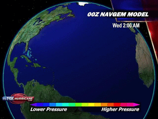 The graphics above show the barometric pressure field. Lower pressures are indicated in dark blue. Higher pressures are indicated in red. Hurricanes and tropical storms, as well as non-tropical low-pressure areas are associated with low pressure (Blue).